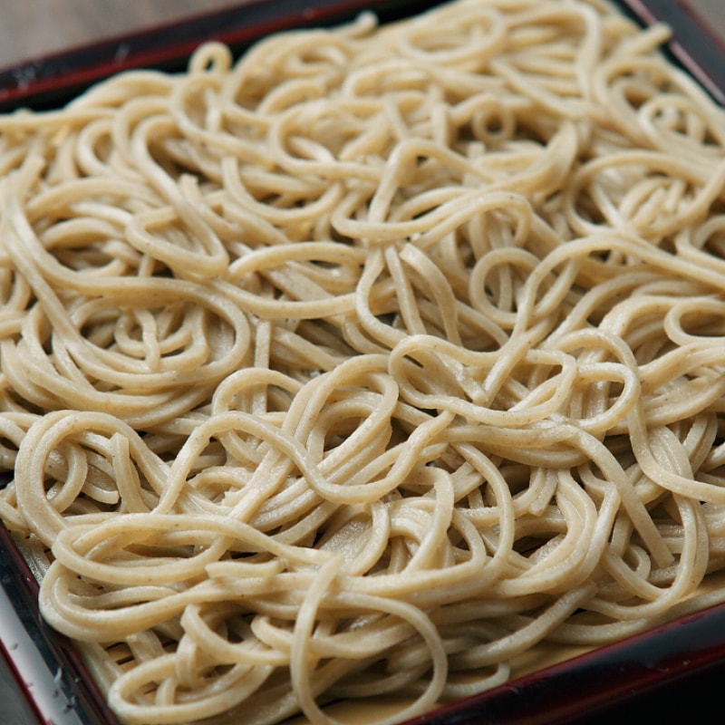 庄司屋の名物の1品でもあります『板そば』は山形特有の田舎そばで、そのルーツは振る舞いそばにあると言われております。更科そばと違い太くて腰の強い藪そばで野性味を感じさせます。この藪そばと更科そばの合い盛になった『更科あいもり板そば』が特にお勧めの一品です。